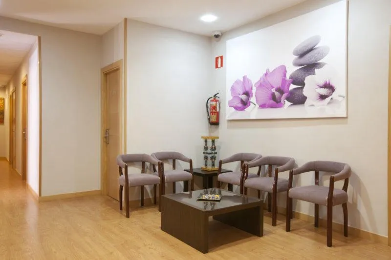 Recepción de madera clara en una oficina o clínica, con mesa y sillas en la sala de espera.