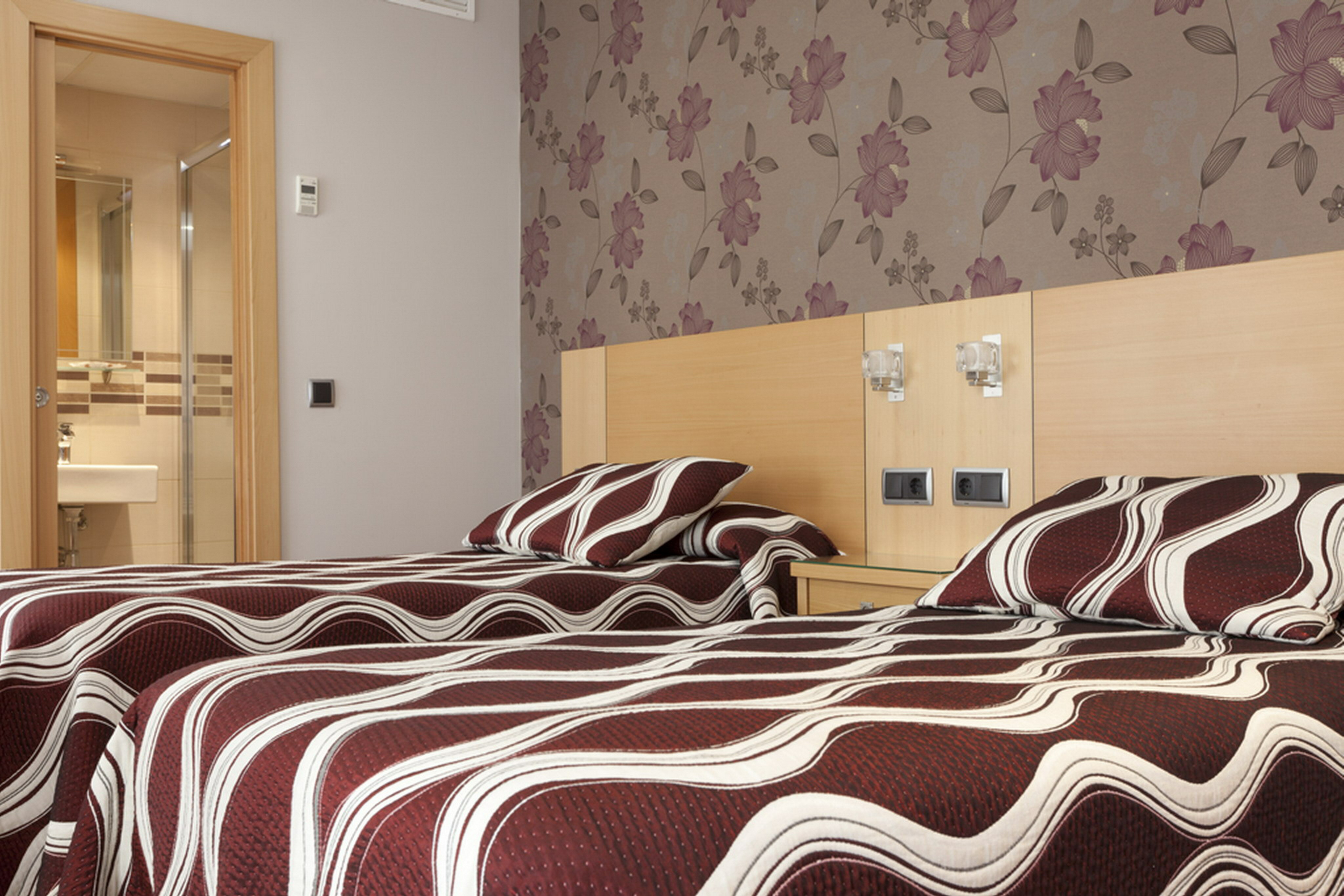 Habitación con dos camas individuales, colchas a rayas y pared con papel pintado floral.